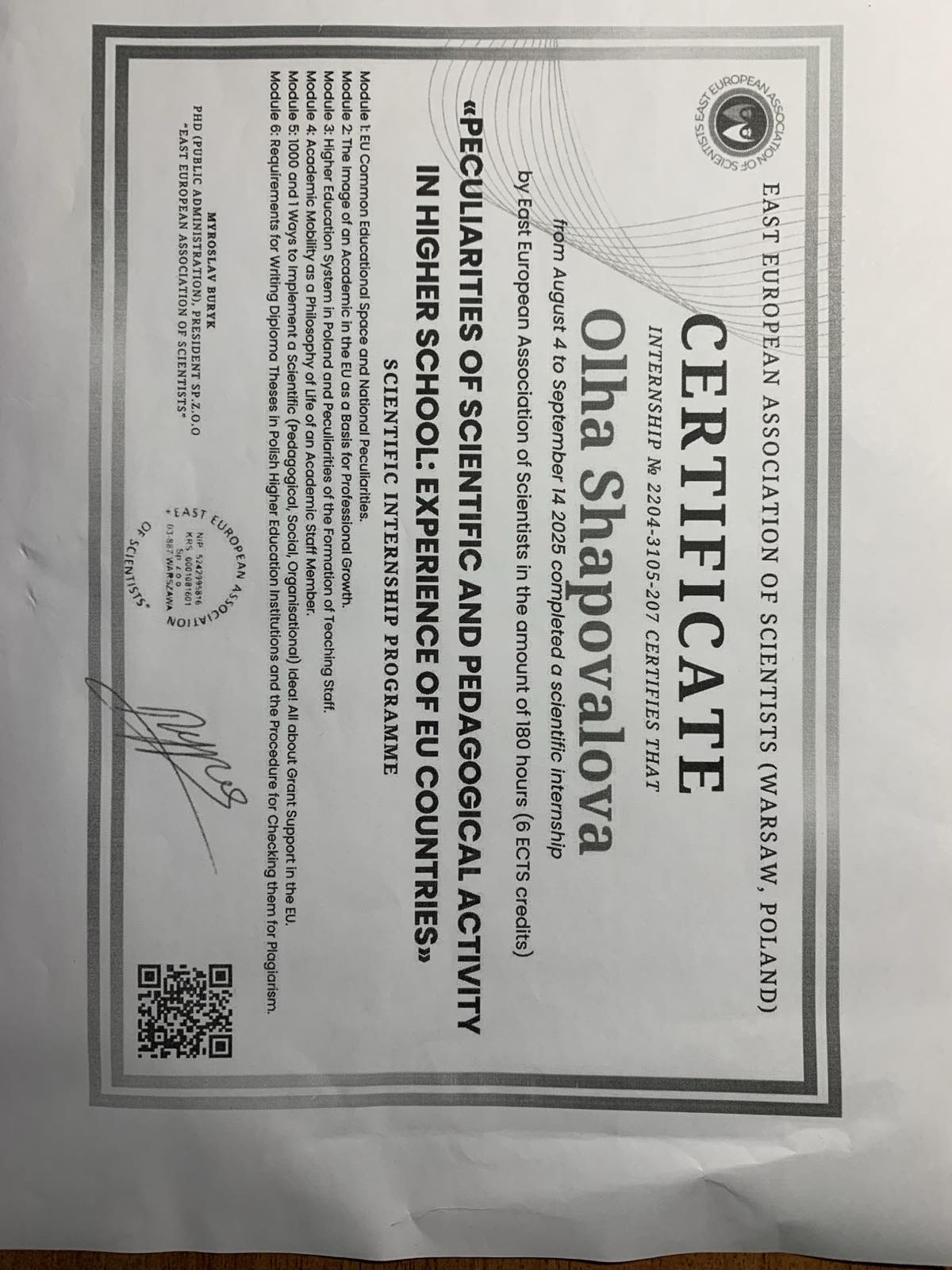 Тема науково-педагогічного стажування: «Особливості науково-педагогічної діяльності у вищій школі: досвід країн ЄС» обсягом 6 кредитів ECTS (180 годин). Одержані результати стажування будуть впроваджуватися в процесі формування професійних компетентностей здобувачів вищої освіти та їх фахової підготовки до роботи в інноваційному освітньому просторі, а також для розробки навчально-методичних посібників та дидактичних матеріалів.
