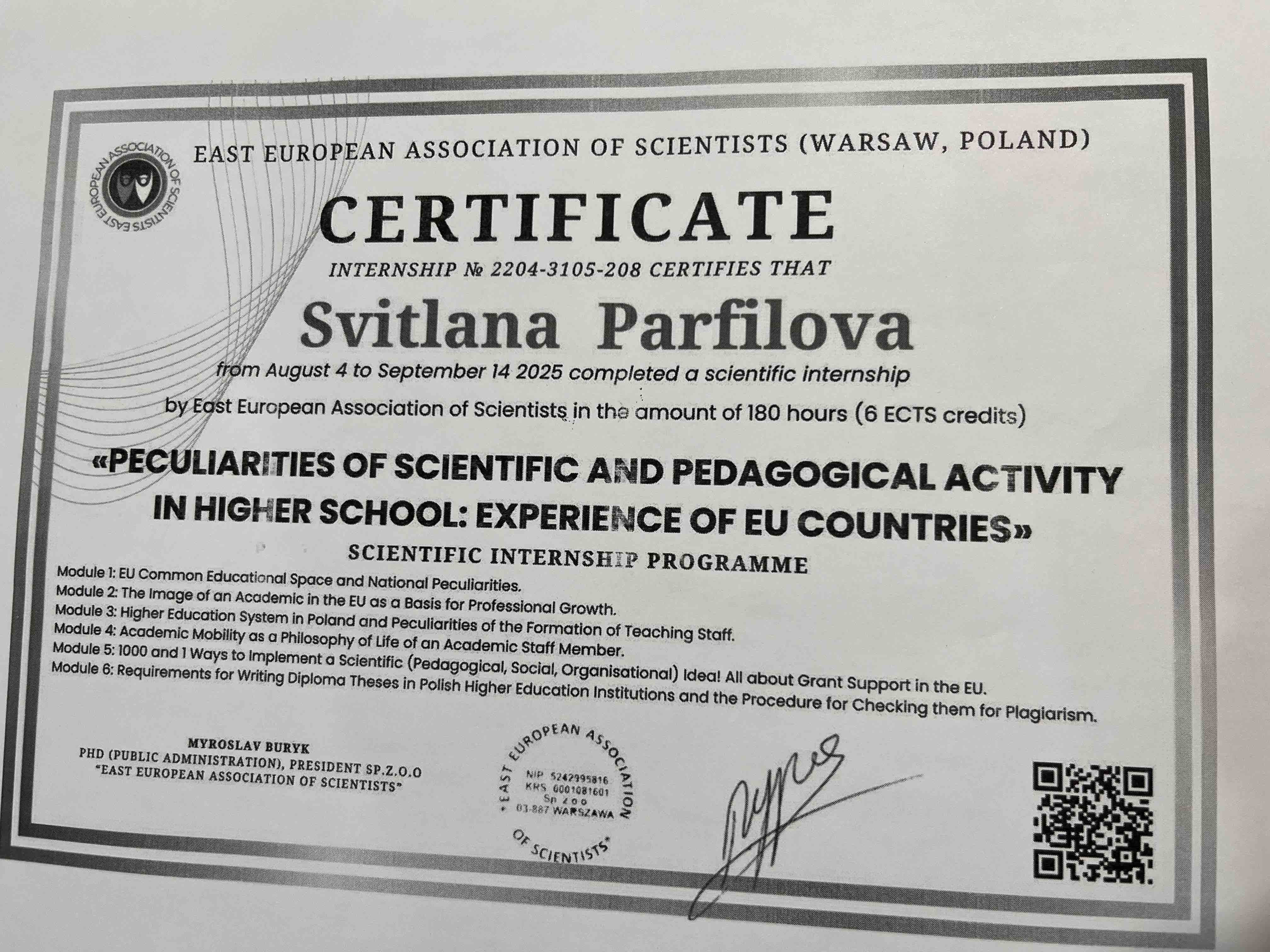 З 04 серпня 2025 р. по 14 вересня 2025 р. канд. пед. наук, доценти кафедри дошкільної і початкової освіти Світлана ПАРФІЛОВА та Ольга ШАПОВАЛОВА взяли участь у програмі Міжнародної академічної мобільності у формі наукового стажування. Науково-педагогічне стажування здійснювалось у Східноєвропейською асоціацією вчених спільно з Інститутом соціальних наук Гданського університету (м. Варшава, Польща).