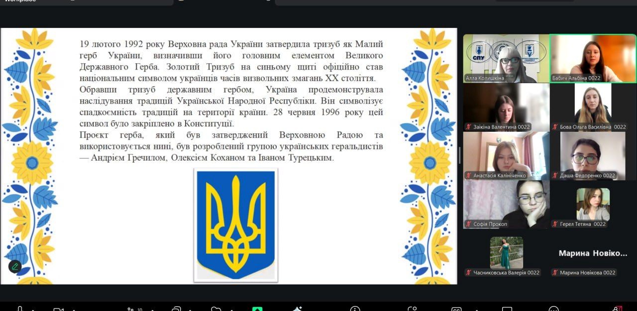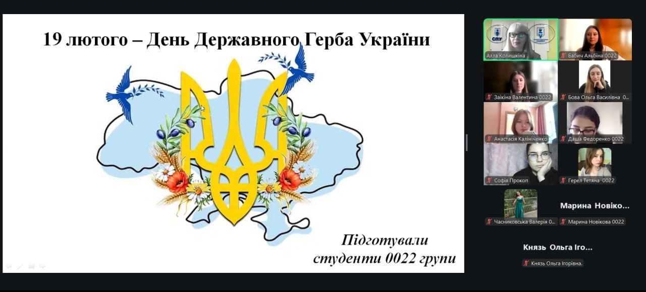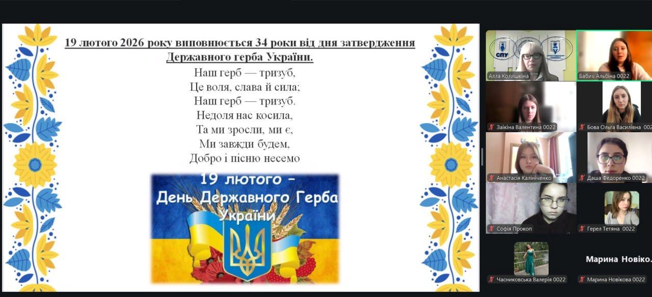 З метою виховання патріотизму, розвитку національної свідомості здобувачів вищої освіти та формування глибокої поваги до символів державності України 19 лютого 2026 року куратором академічної групи доцентом Аллою КОЛИШКІНОЮ було проведено кураторську годину до Дня Державного Герба України зі здобувачами 0022 групи першого (бакалаврського) рівня вищої освіти спеціальності «Початкова освіта».